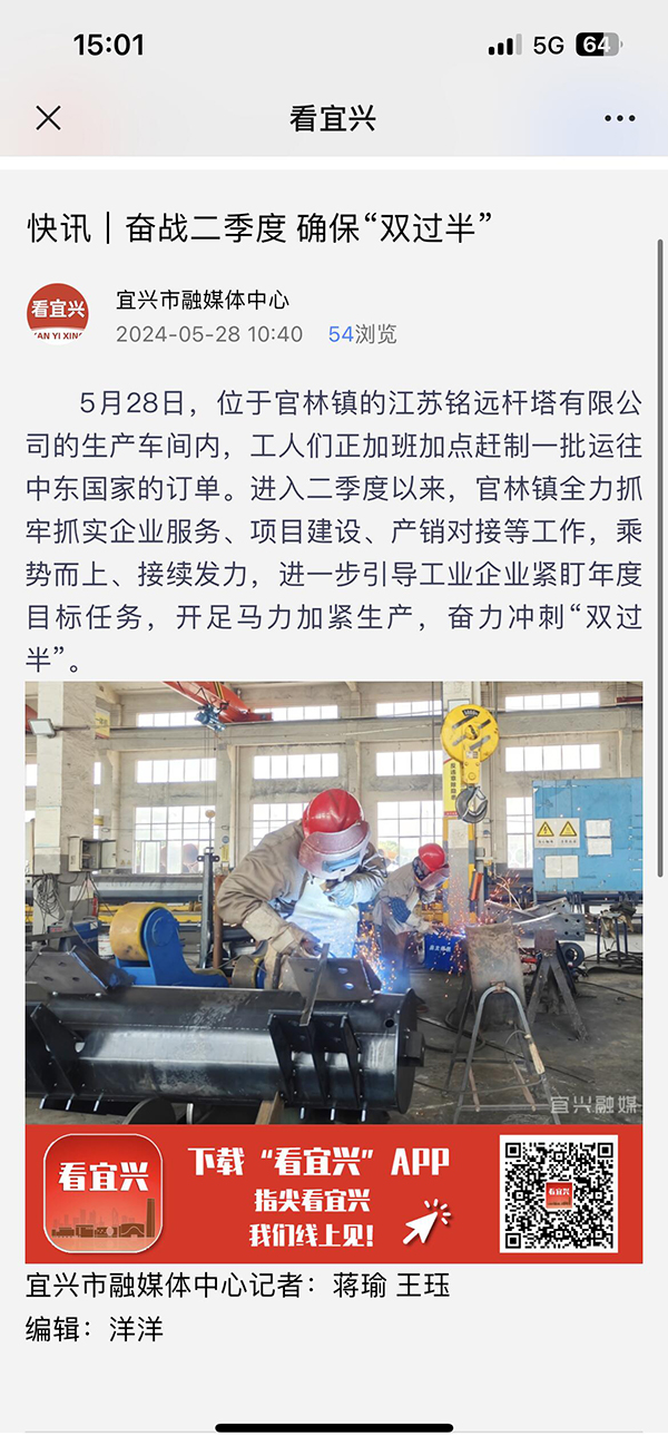 5.28日,宜兴市融媒体中心记着对铭远进行深度采访,走进车间,感受铭远杆塔的魅力。车间一线正如火如荼地生产一批赶往中东国家的订单,铭远作为官林镇的传统制造业企业,一直用匠心坚守,作为先进生产力坚强的后盾,为官林当地经济发展出一份力。
