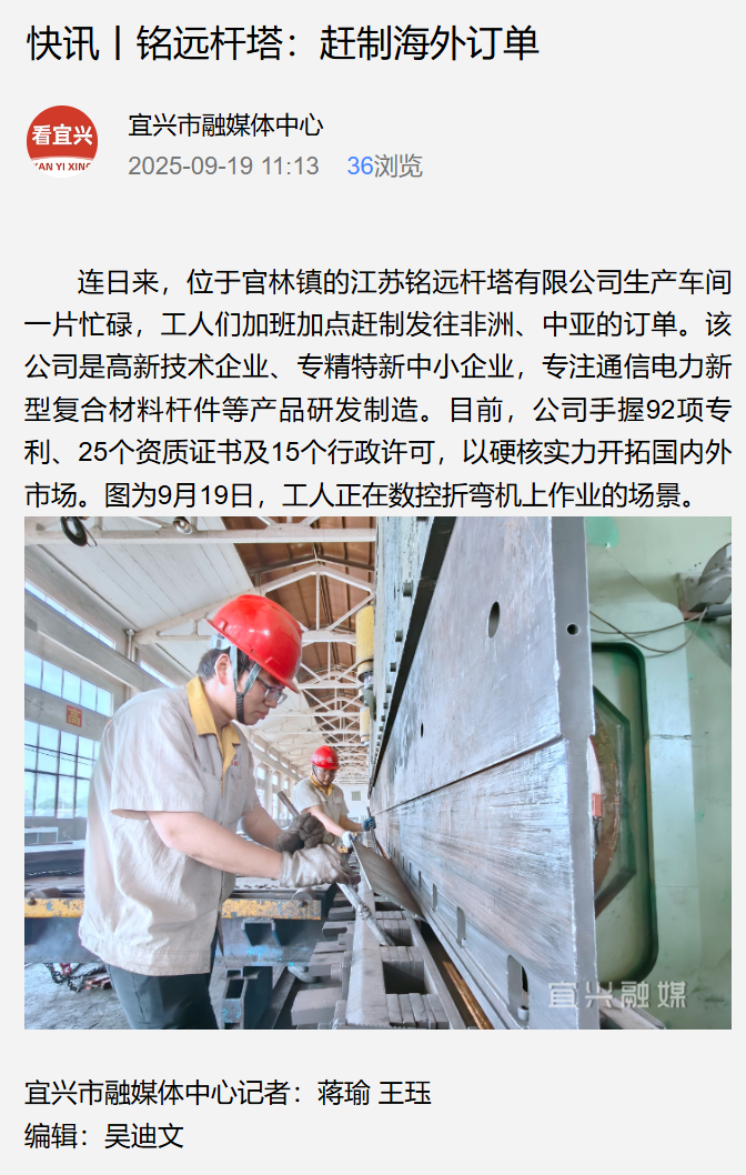 近日,一则关于我司——江苏铭远杆塔有限公司的报道登上了政府新闻版面。报道中,记者用镜头和文字记录下了我们车间一片繁忙、全力生产的景象。这份来自官方的认可,让我们倍感自豪,也激励着我们不断前行!